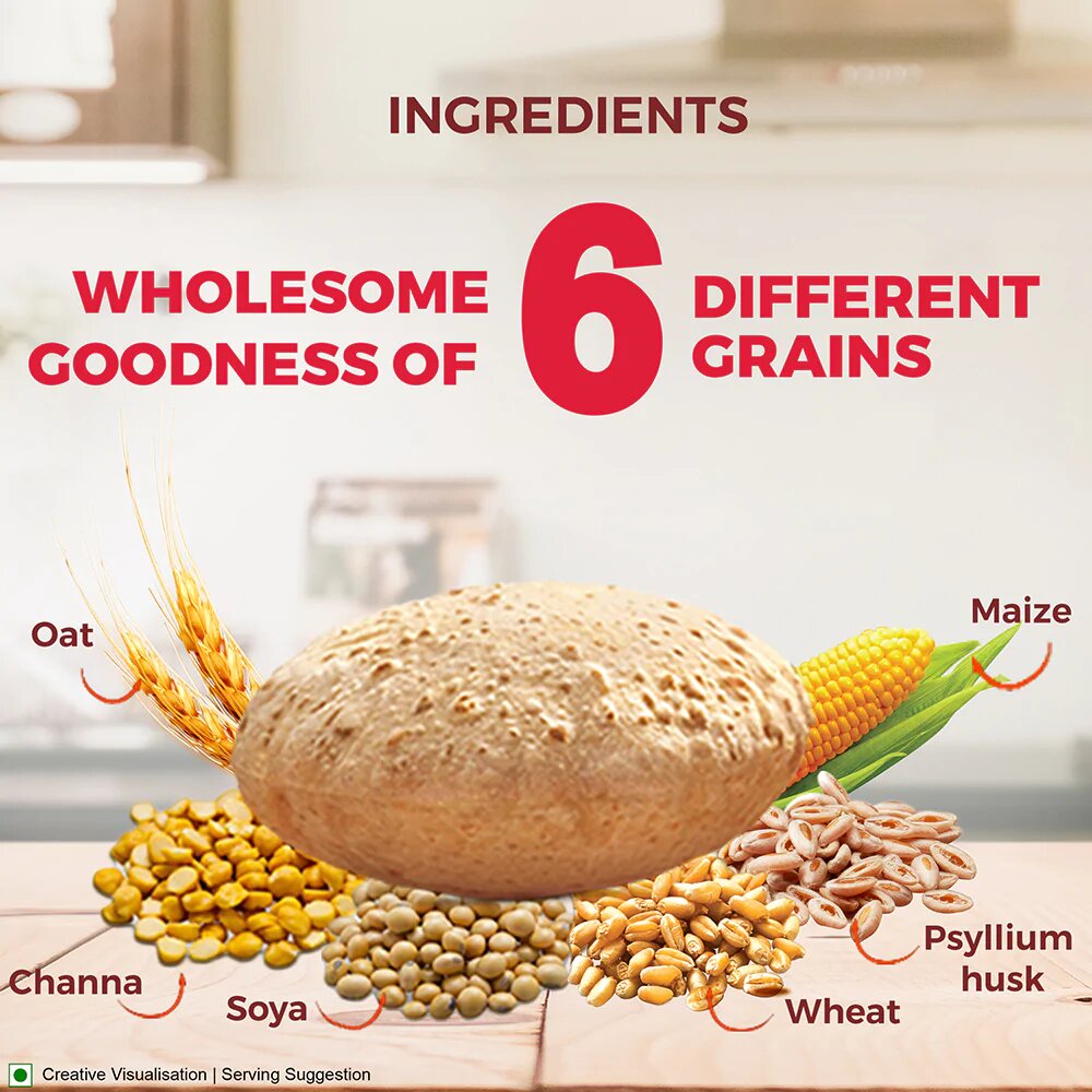 - Main Ingredients: AASHIRVAAD Multigrain Atta is an accurately developed recipe that includes a combination of six different grains such as wheat, maize, soya, chana, oats, and psyllium husk.