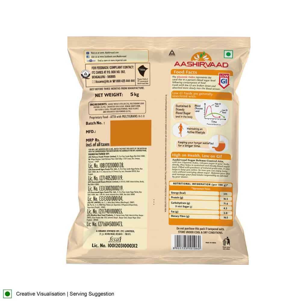 - Main Ingredients – AASHIRVAAD Sugar Release Atta is made from a Natural Grain Mix that includes: Whole Wheat Atta (84.5%), Multigrain Flour Mixture (15.4%) (Defatted Soya Flour, Bengal Gram Flour, Oat Flour, Psyllium husk powder, Maize Flour), and Fenugreek Powder (0.1%)